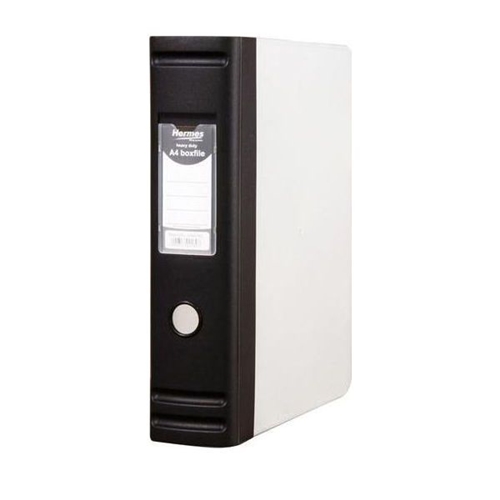 This Hermes box file is made from heavy duty polypropylene for long term filing of A4 documents. The box file features a unique 2 D-ring filing mechanism with a 50mm capacity for up to 500 sheets of 80gsm paper. The file also features a coloured 80mm spine with a finger ring for easy retrieval from a shelf and a removable spine label. This pack contains 1 black box file measuring W80 x D290 x H325mm.