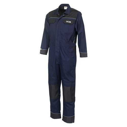 JCB Trade Coverall Navy/Black. 65% Polyester 35% Cotton 245gsm. Top loading reinforced oxford polyester knee pad pockets. Action back with side elastication for movement. Two chest pockets with Velcro flaps. Front YKK zip concealed with studded overflap. Two side access pockets. Concealed stud fastening at cuff and ankle. Hi visibility piping and JCB branding.